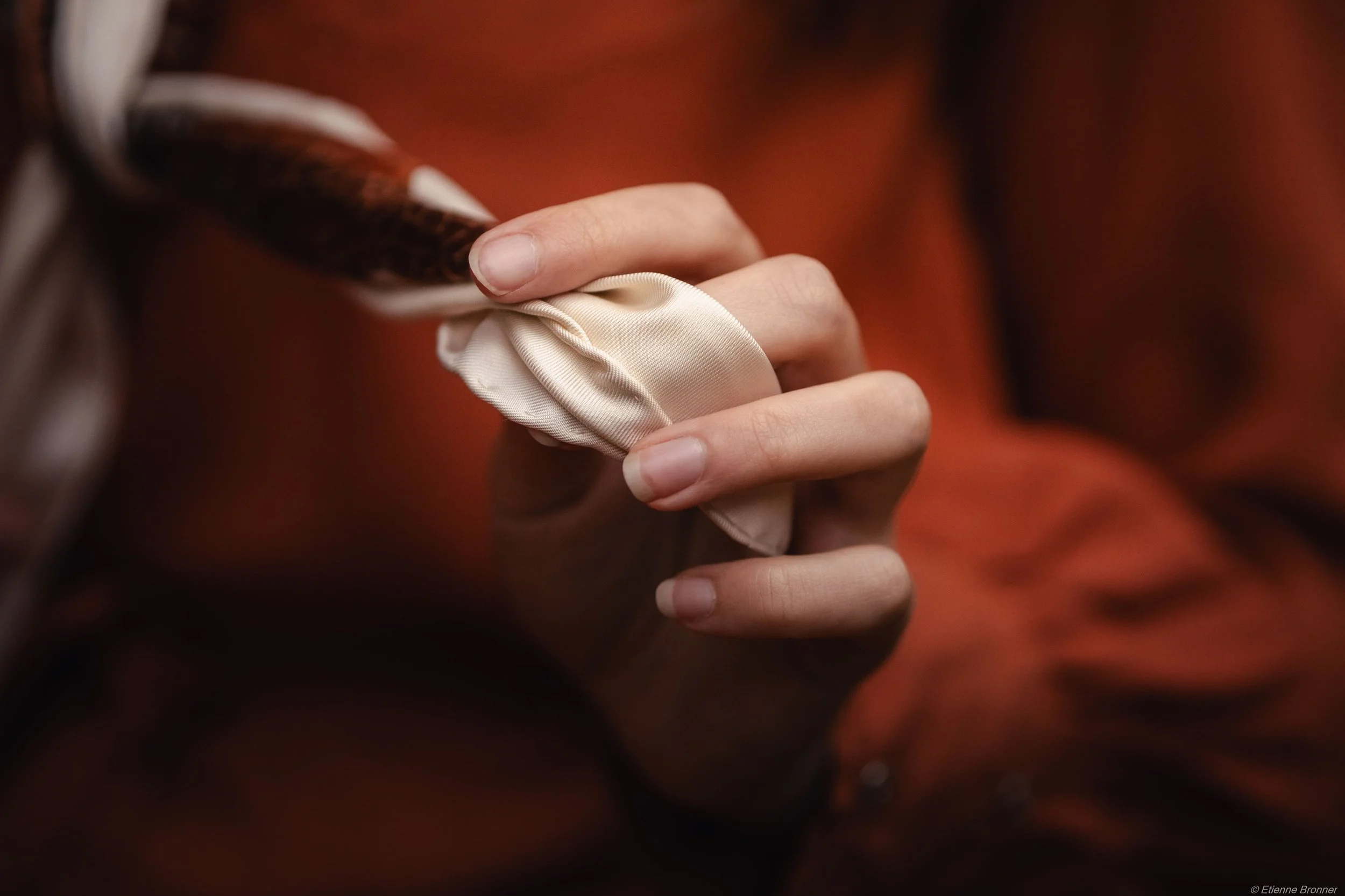 Dans un shooting, il peut être intéressant de faire des photos qui ne prennent pas la personne comme sujet principal. Cela peut être un objet, un mouvement, une action (comme se tenir la main pour un couple). Dans notre cas, sur une photo, j’ai voulu mettre en valeur les détails du tissu du foulard. Je trouve que cela donne une composition complètement différente, mais qui a sa place dans l’album.
